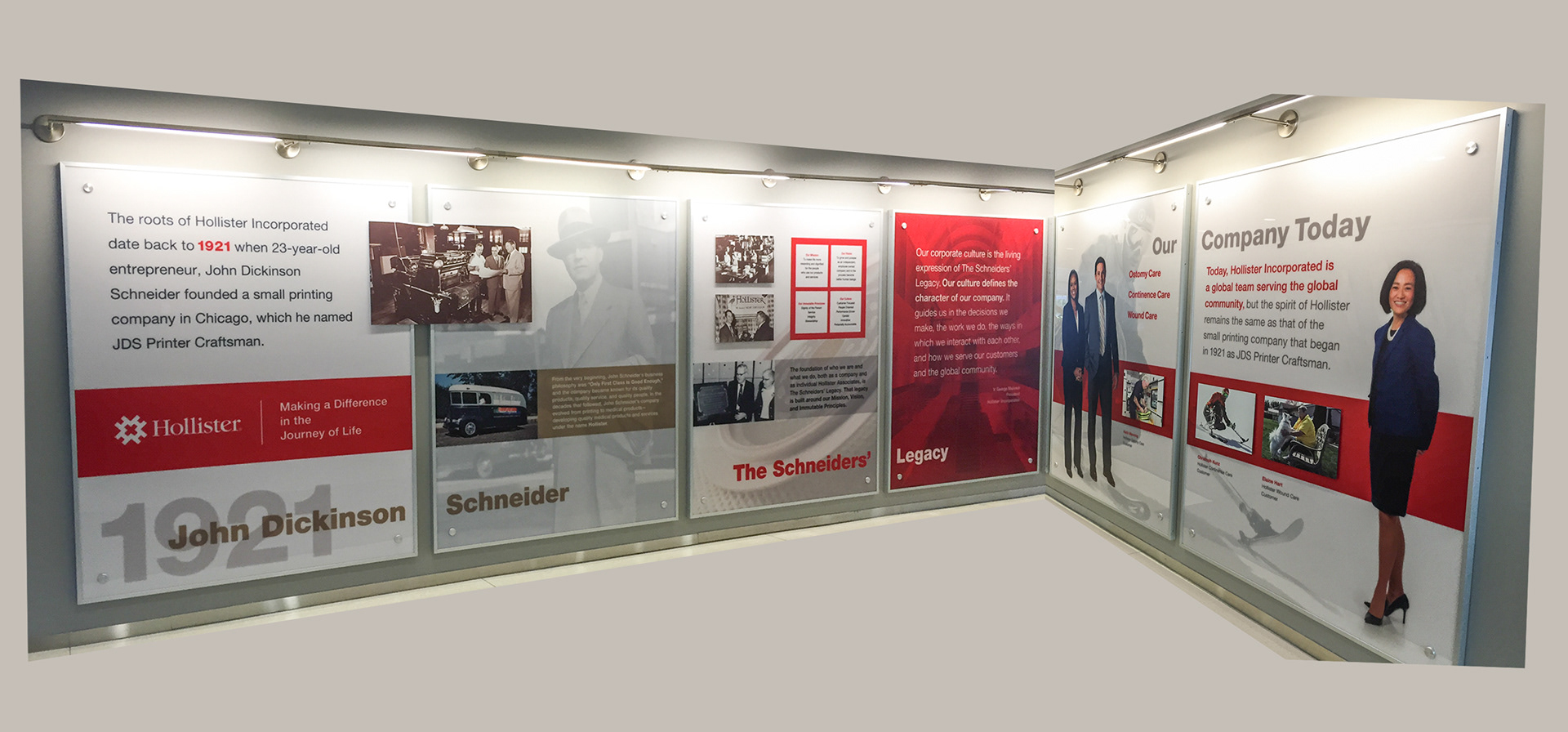 Hollister lobby graphics depicting the history of Hollister Incorporated.
