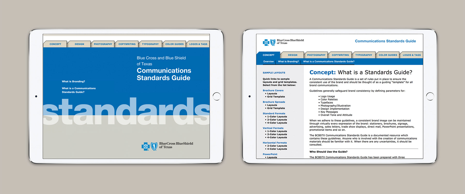 Blue Cross Blue Shield of Texas works with dozens of agencies, designers, marketers, and vendors in the development of the company's consumer health insurance marketing materials. The logistics of communicating its corporate and product brand specifications on a daily basis using traditional methods was overwhelming. During the rollout of the new BCBSTX consumer brand identity, I worked with the Dallas team to design and develop an interactive, browser-based brand guidelines system that was easy to update and accessible 24/7.